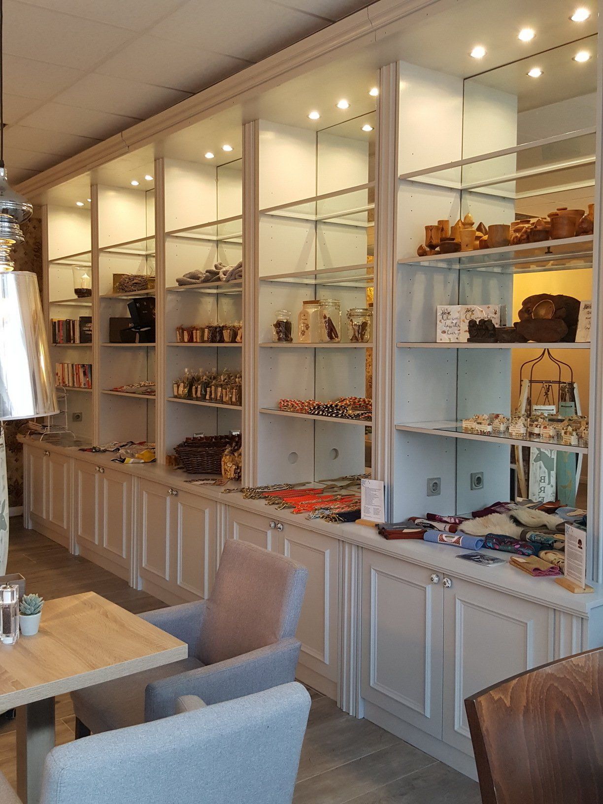 Im hellen Hauptraum des Cafés Marie Lou besticht der Tresen mit den extravaganten, riesigen Lampen. Im dazu gepachteten Nebenraum lädt unser frisch aufgemöbeltes Vintage-Regal zum Stöbern ein.