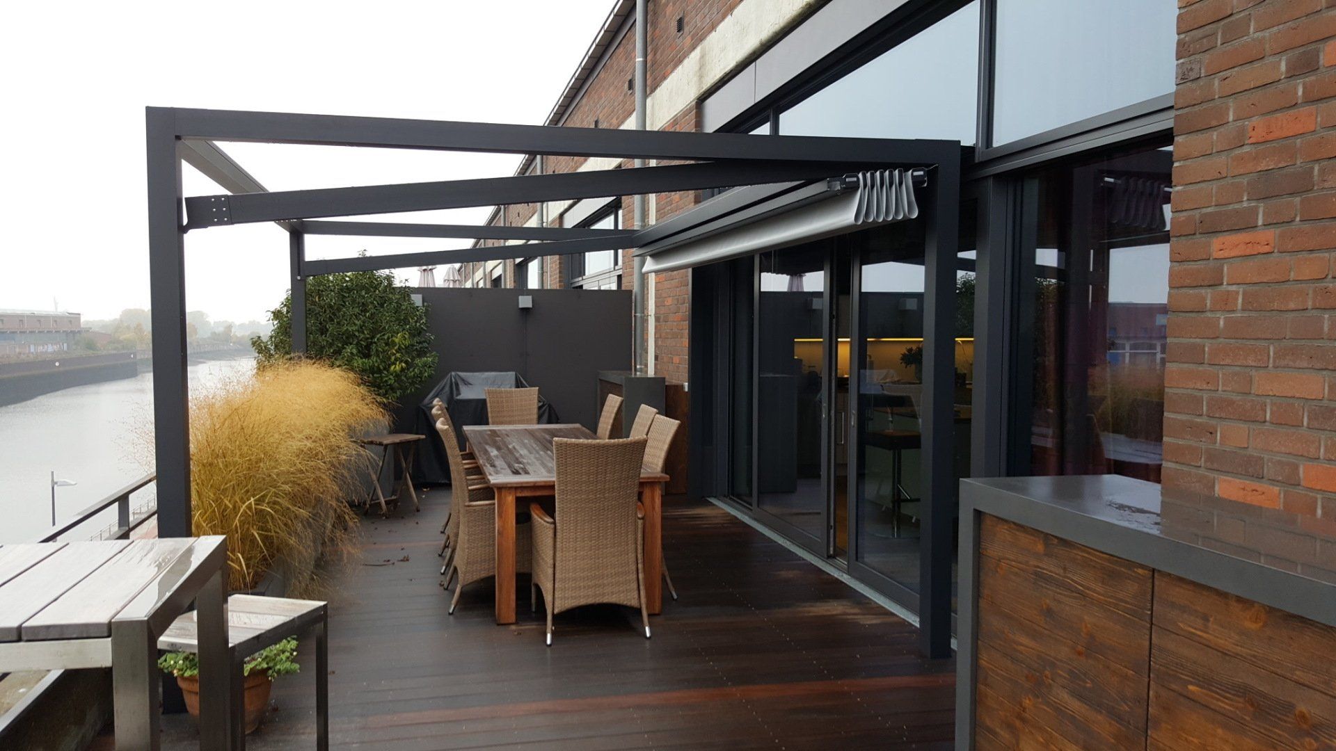 Dem typischen Bremer "Schietwetter" trotzen diese Aussenmöbel. Mit Highlights wie dem beleuchteten Sockel, der versteckten Beleuchtung im hinteren, abgesenkten Schrank und der ausfahrbaren Lausprecher setzen sie die Terrasse über den Dächern der Überseestadt so richtig in Szene. Die neue Pergola lädt auch bei Regen zu gemütlichen Stunden ein.